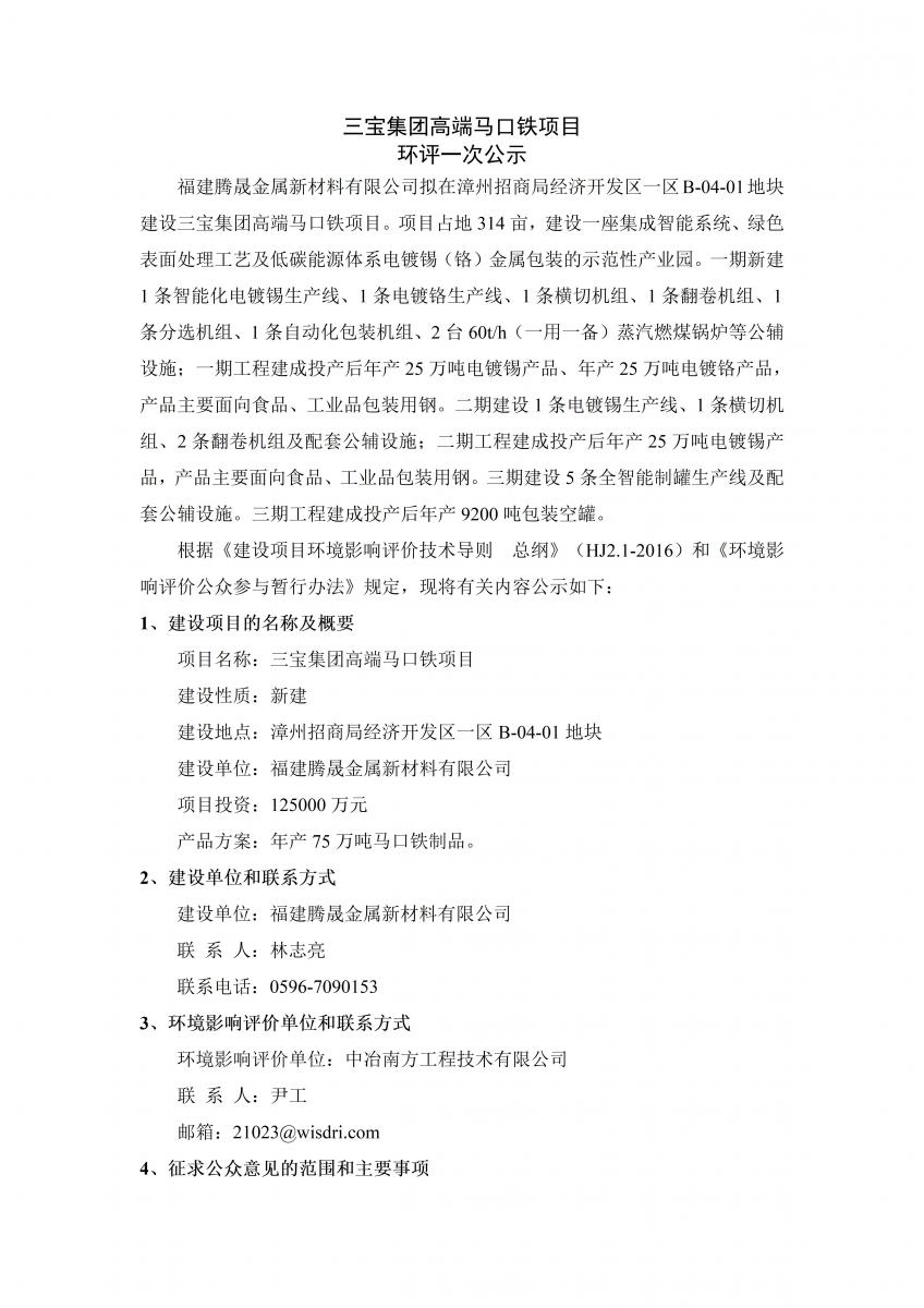 三寶集團(tuán)高端馬口鐵項(xiàng)目 環(huán)評一次公示